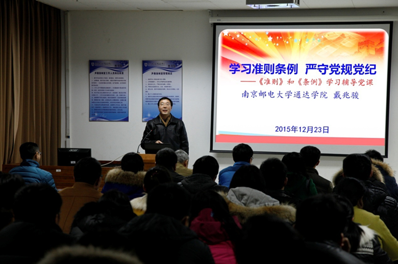 12月23日下午,院党委在图书馆4楼声像放映室举行了学习贯彻《中国共产党廉洁自律准则》和《中国共产党纪律处分条例》(以下简称《准则》和《条例》)专题党课。学院党委理论学习中心组成员、80多名教工党员与教工入党积极分子参加了此次教育活动。院党委书记戴兆骏主持此次教育活动并作专题辅导。