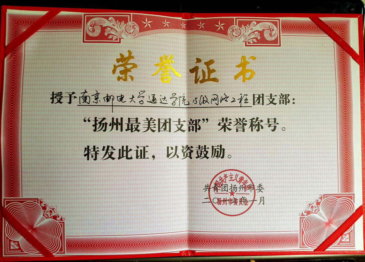1月26日下午,由扬州团市委、扬州广播电视总台联合举办的2015年度扬州“最美团支部”网络评选结果揭晓,威尼斯官网2015级网络工程专业团支部经过前期角逐,最终荣获由扬州团市委授予的“扬州最美团支部”荣誉称号。