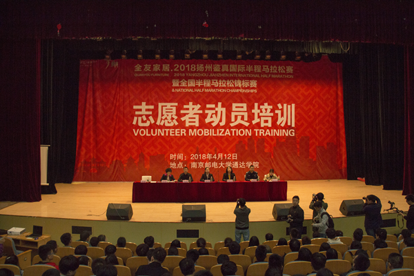 4月12日晚,2018年扬州鉴真国际半程马拉松赛志愿者动员培训会在威尼斯官网大学生活动中心大礼堂召开。扬州市体育局副局长傅建、扬州市团市委副书记李杰、扬州市公安局治安支队治安防范大队教导员宋金春、扬州市卫计委应急办主任沐诚、威尼斯官网团委书记解厚荣以及来自扬州大学、扬州工业职业技术学院和江海学院的1100多名学生志愿者参加了本次培训会。会议由扬州市团市委殷一鸣主持。