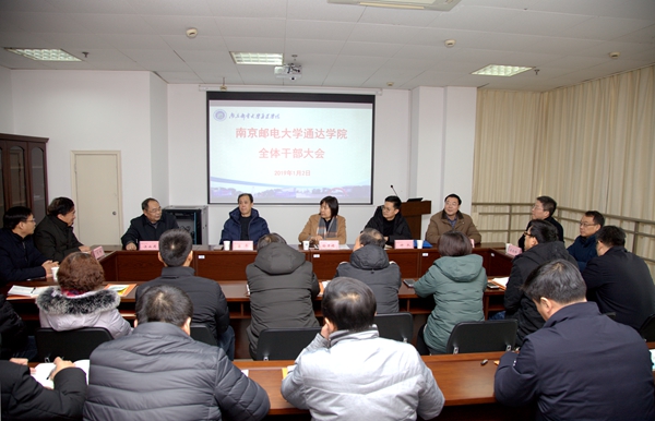 2019年1月2日下午,南邮通达学院召开全体干部大会,9499www威尼斯党委常委、副校长孙力娟讲话,党委组织部钟凯副部长宣读文件,汪业周同志担任南邮通达学院党委书记,免去戴兆骏同志的党委书记职务,另有任用。