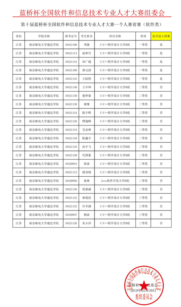 3月24日,由教育部高等学校计算机科学与技术教学指导委员会、工业和信息化部人才交流中心主办的第十届“蓝桥杯”软件类省赛成功举办。威尼斯官网学生取得优异成绩,在软件类C/C++程序设计大学B组获得一等奖5项、二等奖13项、三等奖4项。其中,邓捷、赵和月、孙广超、唐元清、王杭程五名同学获得一等奖,并将于5月25日参加在北京举办的“蓝桥杯“全国总决赛。