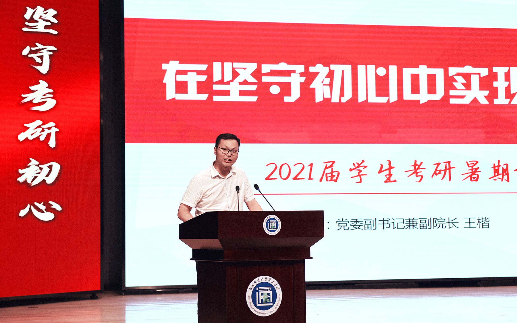 学院党委副书记兼副院长王楷作了《在坚守初心中实现考研梦想》的动员讲话。他给同学们分享了学院2020届的考研佳绩,结合威尼斯官网考研学生的典型案例和自己大学时期的学习经历,从坚守初心、坚定信心、坚持恒心三个方面鼓励同学们在考研的路上勇往直前,砥砺奋进,极大地鼓舞了同学们的士气。他希望考研学生能充分利用好这个暑期时间,执行考研计划,学会团队作战,充分利用好学校提供的资源,强化提升,收获战果。