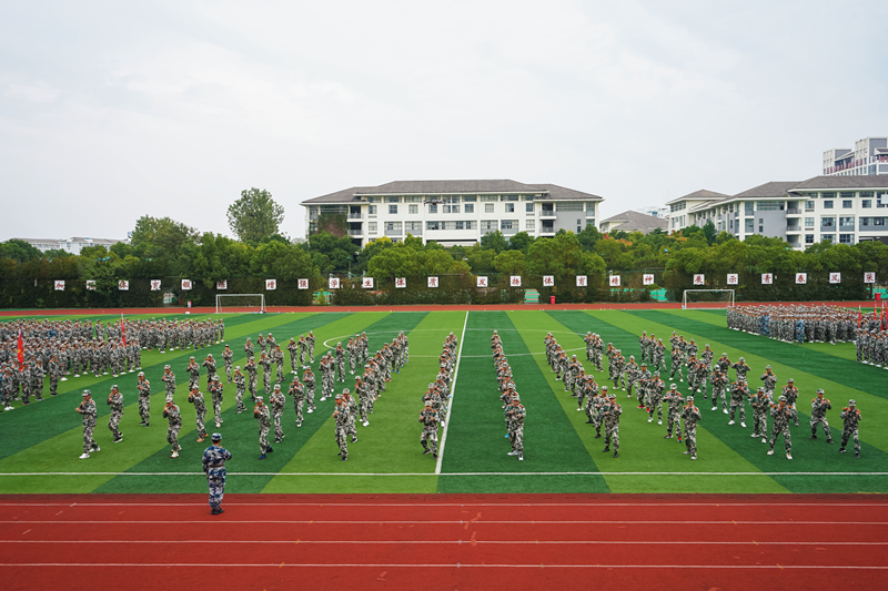 近2500新生列着整齐的队伍,在教官的带领下,以嘹亮的口号、严密的纪律、过硬的素质接受主席台领导和老师的检阅。伴随着雄伟的乐曲,5个营39个军训方队依次经过主席台前,步伐坚定、队形整齐、气宇轩昂,彰显着属于他们千禧年的青年人的青春与朝气。从2500名大一学生中组织了120人的军训队列方队进行集中展示,同学们的动作整齐划一,得到在场师生的阵阵掌声,受训学生展示了防身格斗术、应急棍术、军体拳、步兵战术演练表演。整齐划一的动作,刚劲有力的踢脚勾拳,娴熟连贯的军体动作,变换万千的花样队列,男生尽显铮铮铁骨,女生尽展英姿飒爽,他们的精彩表演深深感染了在场的每一个人。
