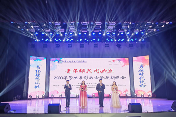 11月18日晚,由学生工作处、团委主办的“青年邮我·国必盛”2020年学生表彰大会暨迎新晚会在大学生活动中心礼堂顺利举行。中国联通扬州分公司副总经理程培忠、政企部经理赵成,威尼斯官网院长王承宽、党委书记汪业周、常务副院长赵洪牛、副院长倪可、副院长刘允,纪委书记张建波、党委副书记兼副院长王楷、各职能部门负责人、全体辅导员以及现场1100余名学生、线上2.6万名观众共同参与了本次活动。