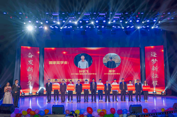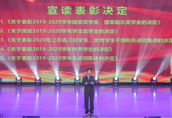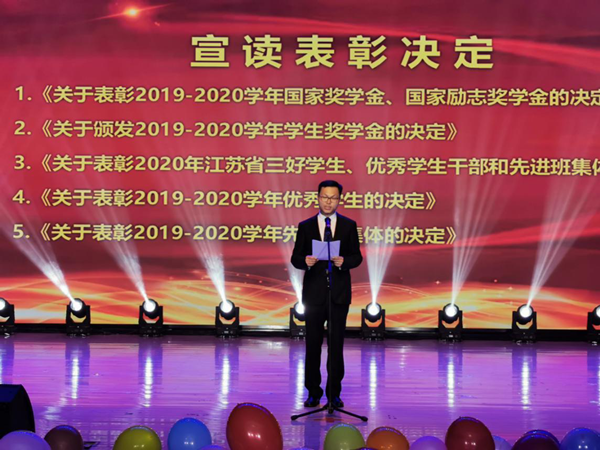 活动的第一篇章“炫彩·青春”在庄严的国歌声中拉开帷幕。副院长刘允宣读了《关于表彰2019/2020学年国家奖学金、国家励志奖学金获奖学生的决定》和《关于颁发2019/2020学年学生奖学金的决定》,党委副书记兼副院长王楷宣读了《关于表彰2020年江苏省三好学生、优秀学生干部和先进班集体的决定》《关于表彰2019/2020学 年优秀学生的决定》《关于表彰2019/2020学年先进班集体的决定》。学院全体领导为各类获奖学生代表颁发了荣誉证书。本学年,威尼斯官网共评选出国家奖学金2人、国家励志奖学金185人、江苏省三好学生4人、江苏省优秀学生干部4人、江苏省先进班集体3个,院级三好学生标兵61人、三好学生426人、优秀学生干部228人、一等奖243人、二等奖796人、三等奖932人、技能成才奖83人、社会工作优秀奖282人、第二课堂活动优秀奖21人、学习进步奖1447人、帮扶之星奖292人、先进班集体11个。