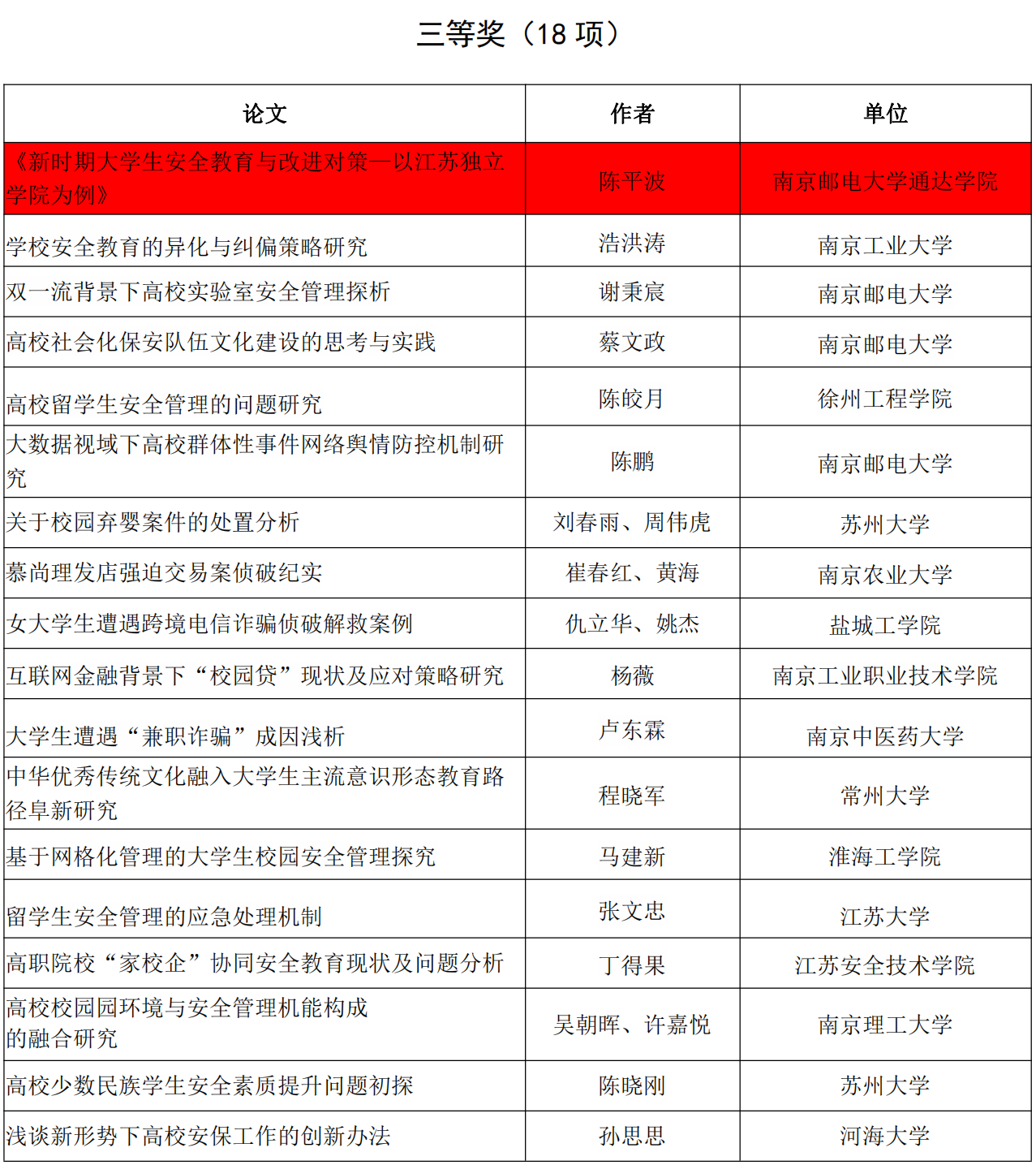 近日,江苏省高等教育学会高校保卫学研究委员会发文《关于表彰2018-2019年度优秀科研成果的决定》(高保字[2021]7号),威尼斯官网保卫处陈平波同志发表的《新时期大学生安全教育与改进对策—以江苏独立学院为例》论文荣获科研成果三等奖 。