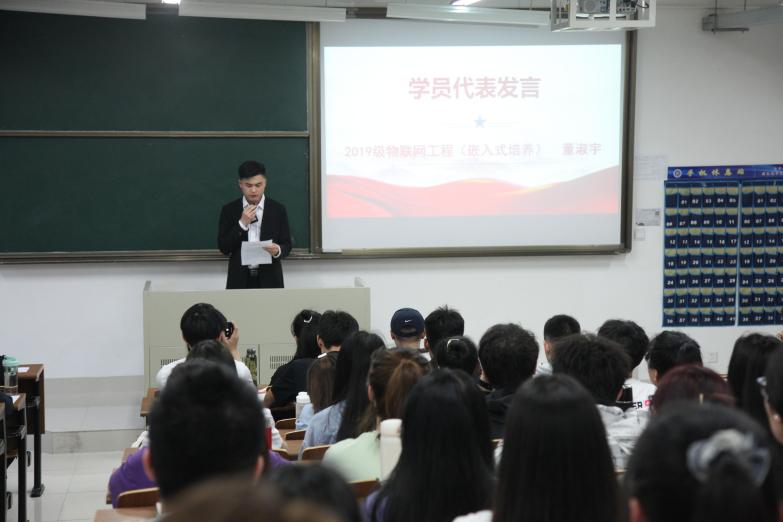 开班仪式在庄严的国歌声中拉开帷幕。随后,培训班班主任姜力波老师向学员介绍本期入党积极分子培训班培训计划并提出学习要求;2019级物联网工程(嵌入式培养)董淑宇同学代表全体培训班学员作了表态发言。