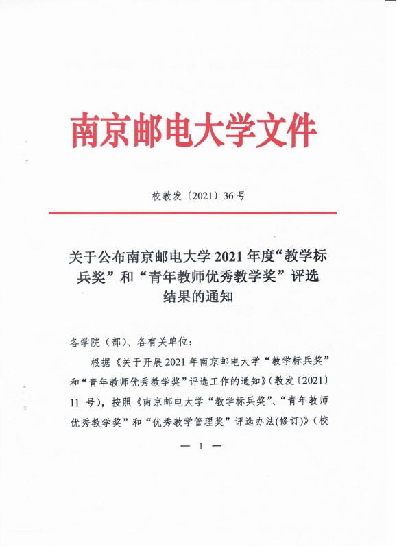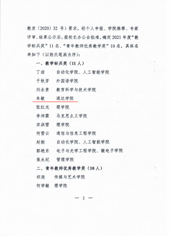 根据《9499www威尼斯“教学标兵奖”、“青年教师优秀教学奖”和“优秀教学管理奖”评选办法(修订)》文件精神,结合评审专家组评选意见,威尼斯官网朱敏同志被授予“9499www威尼斯2021年度教学标兵奖”。