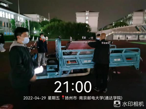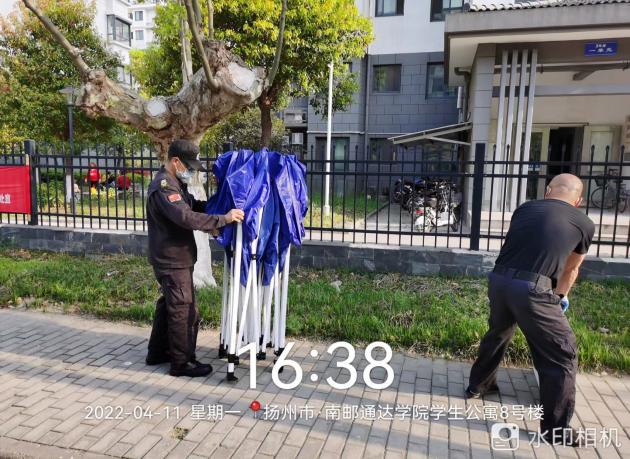 4月29日晚7点学院接到第二日上午全员核酸检测的通知。为提前做好充足准备,后勤管理处决定当晚布置核酸检测场地。学院东吴物业接到任务后迅速动员所有住校员工加班加点,分别在一号教学楼、图书馆西侧、篮球场、田径场、体育馆等区域搭建核酸检测点。在物业经理的组织下,帐篷、桌椅、防疫标识牌的搬运,1.5米间隔线、出入口引导牌的张贴,一脱区、二脱区、医废暂存区的布置,均有条不紊地进行。至晚10:30,核酸检测场地全部布置完毕。