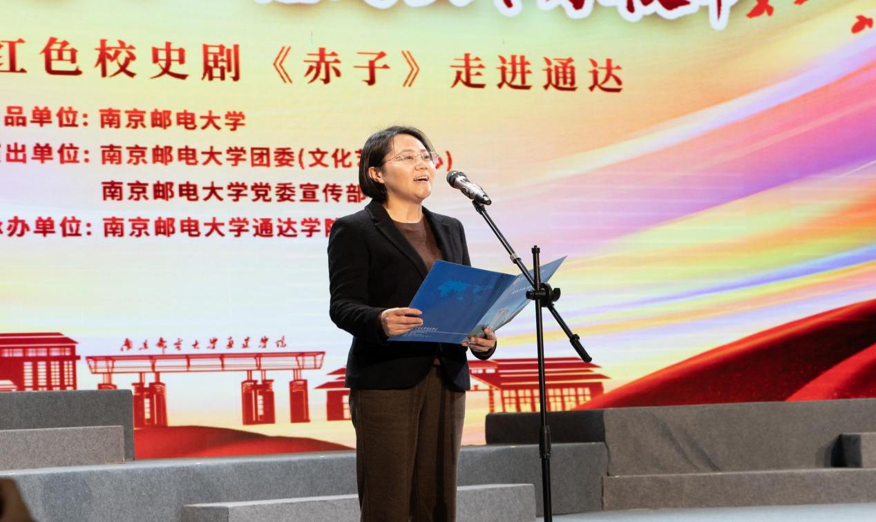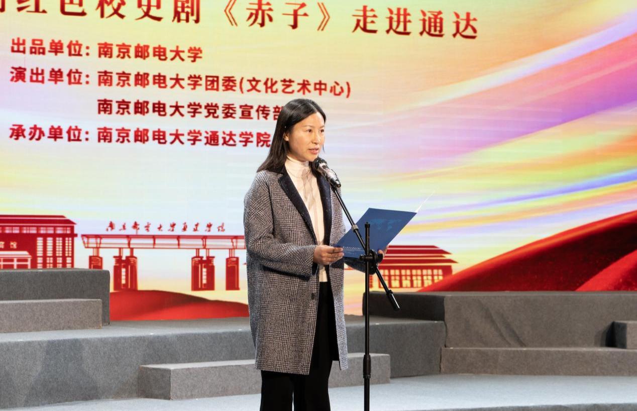 通达学院党委书记赵允玉致辞。她对观演嘉宾表示欢迎,对《赤子》剧组到通达学院演出表示感谢。她指出校史剧《赤子》演出是一堂生动的思政课,是一种沉浸式实践教学,定会引起师生情感共鸣,激发爱国报国之志。