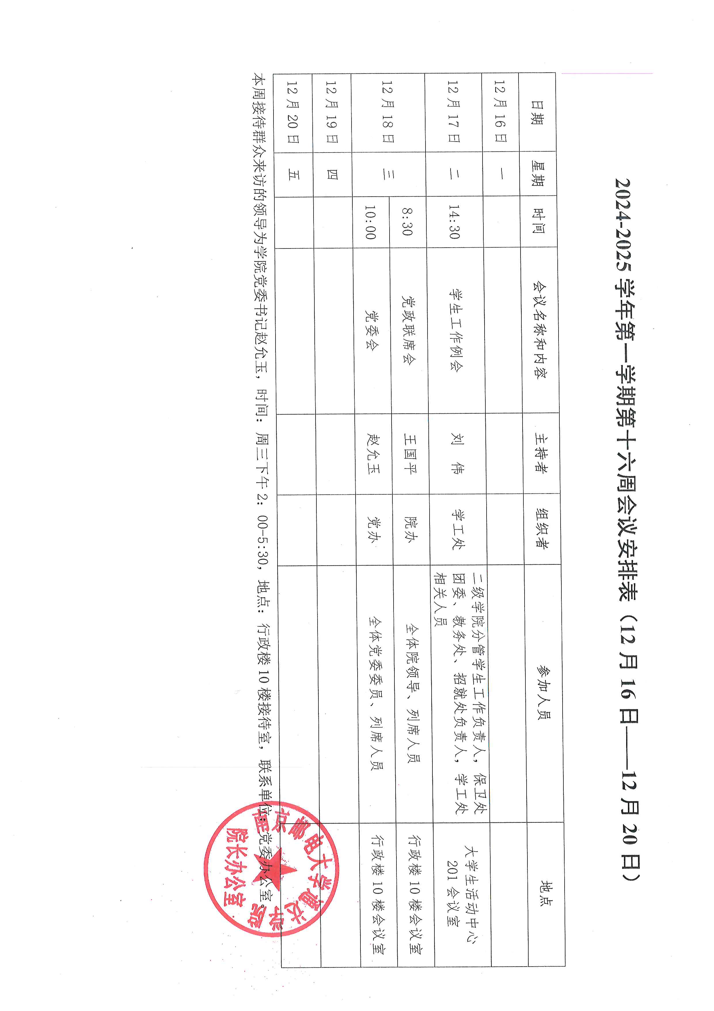 2024-2025学年第一学期第十六周会议安排表
