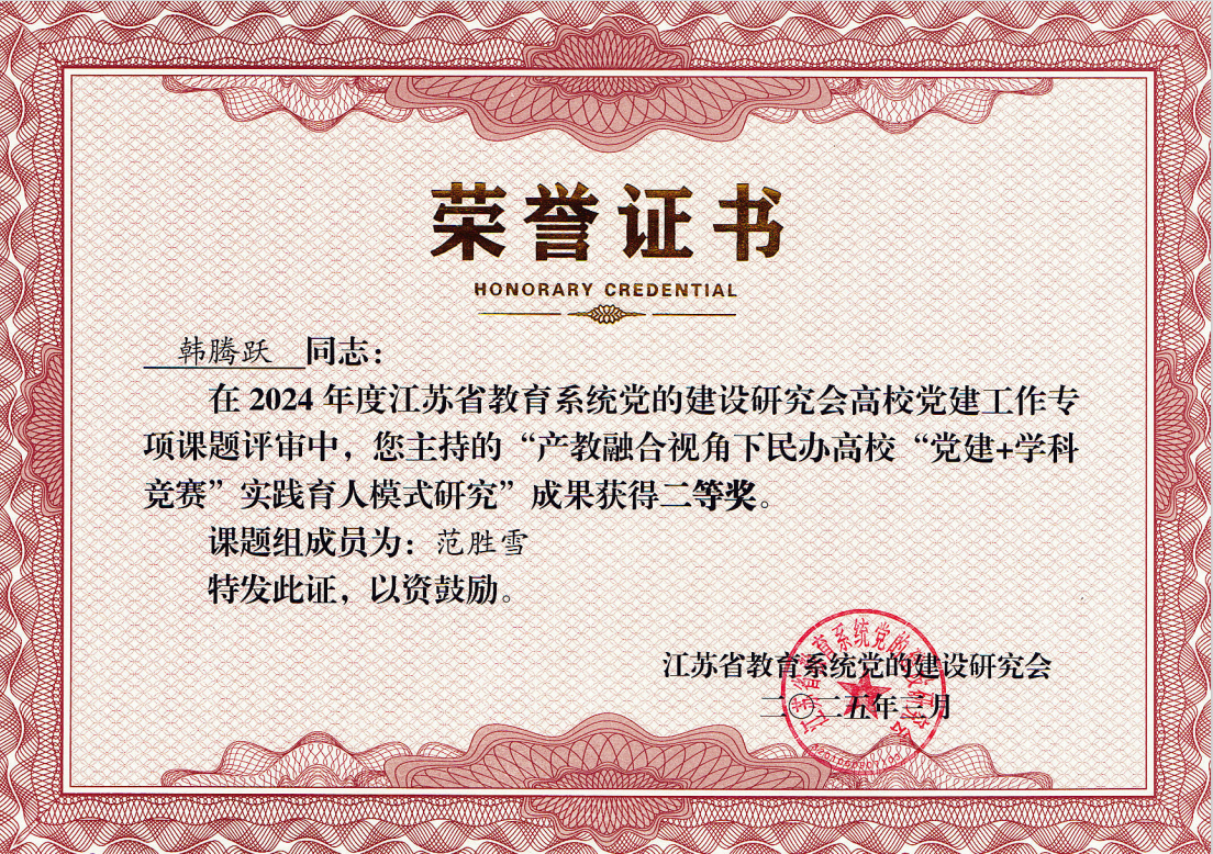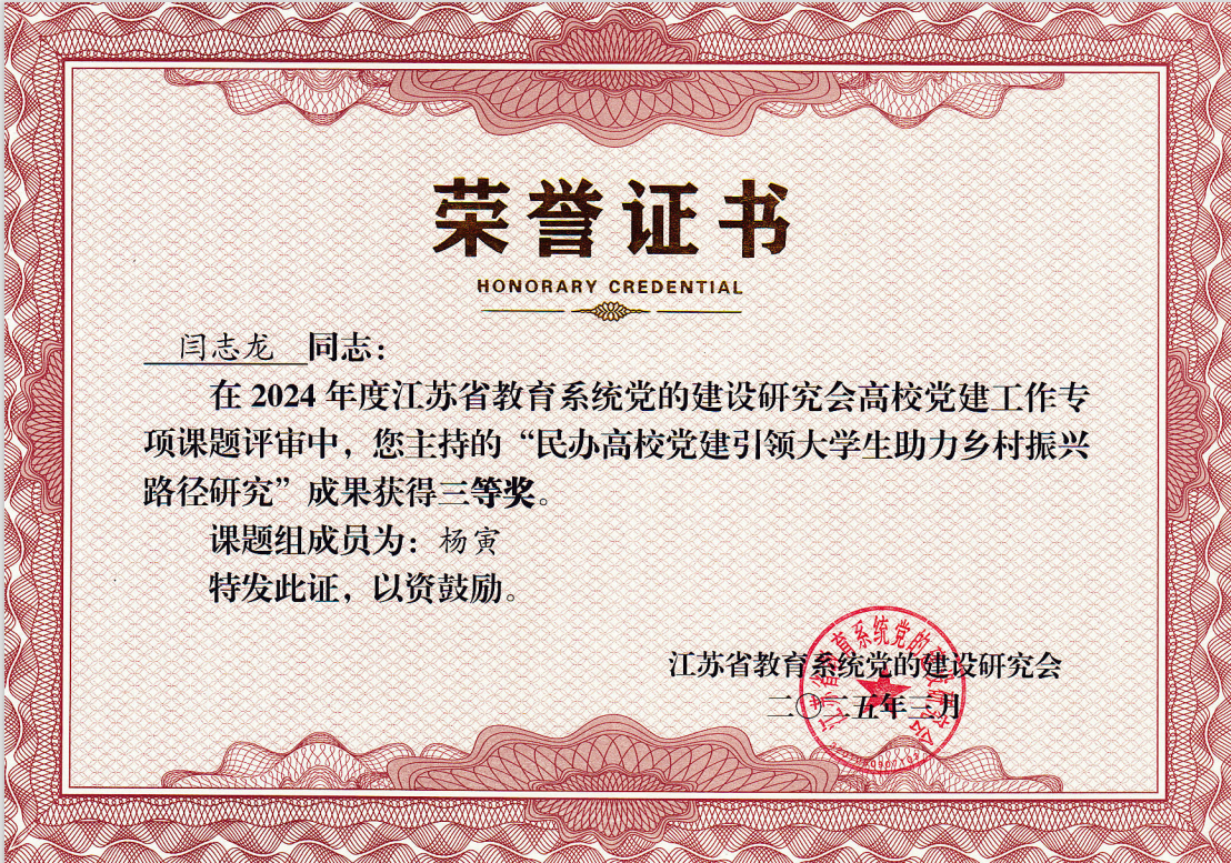 近日,江苏省教育系统党的建设研究会公布2024年度高校党建工作专项课题评审结果。在此次评审中,威尼斯官网计算机工程学院教师韩腾跃、电气工程学院教师范胜雪申报的课题《产教融合视角下民办高校“党建+学科竞赛”实践育人模式研究》,凭借创新的研究视角与扎实的实践探索,荣获二等奖;商学院教师闫志龙、杨寅申报的课题《民办高校党建引领大学生助力乡村振兴路径研究》,立足时代需求,深入调研分析,荣获三等奖。