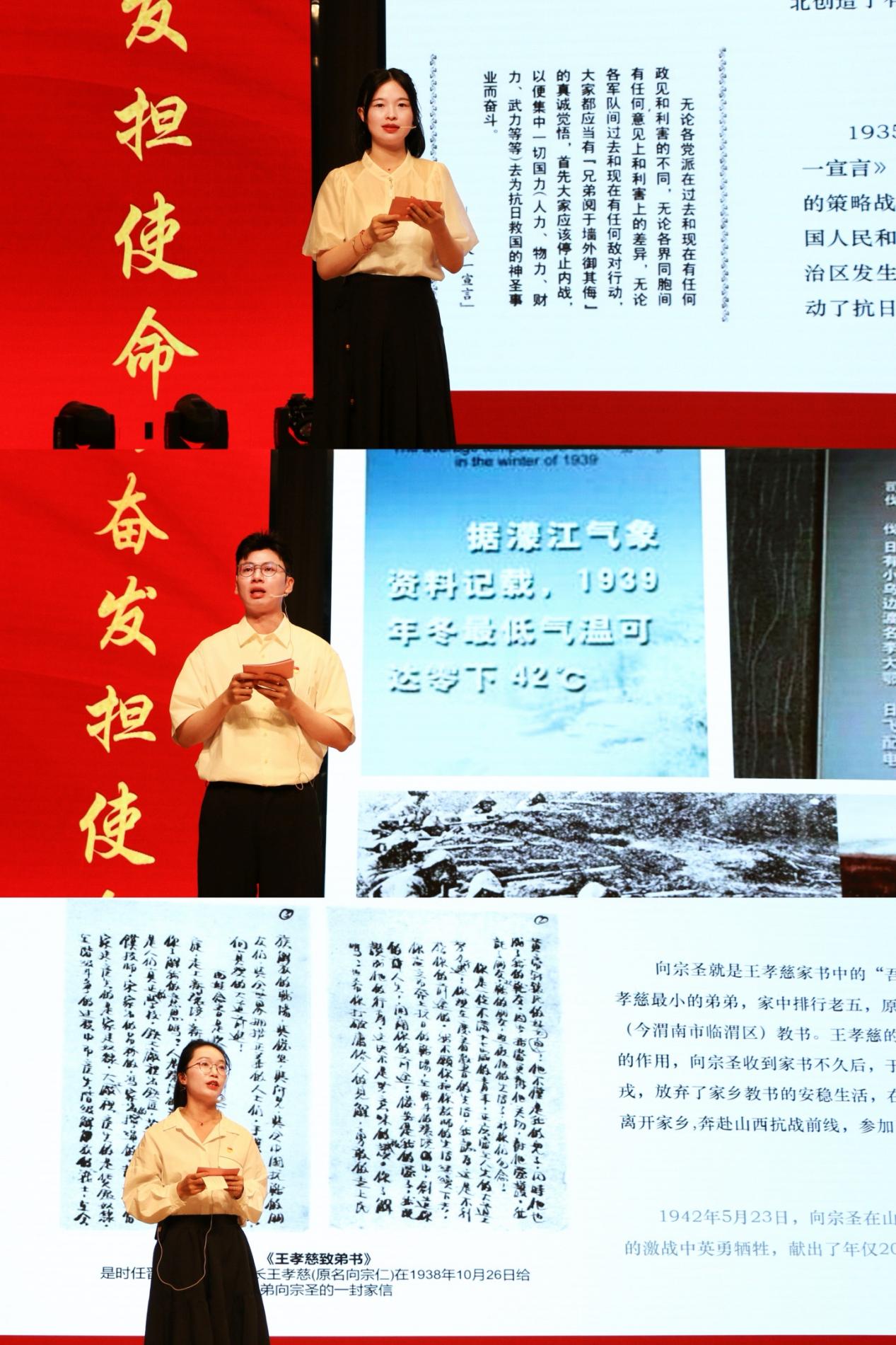 威尼斯官网第四届辅导员宣讲团成员紧扣“中国人民抗日战争暨世界反法西斯战争胜利80周年”时间节点,围绕“浴血十四载,铸就民族魂”“热血护山河,丹心照汗青”“家书诉壮志,精神励后人”三个篇章,依托于珍贵历史影像与详实数据,全景式回顾了从1931年局部抗战到1945年全面胜利的壮阔历程,通过讲述震撼人心的抗战故事和演绎穿越烽烟的革命家书,生动勾勒出中华民族的精神群像,以沉浸式叙事与互动化表达形式,带领师生穿越历史烽烟,感悟伟大抗战精神的时代回响。