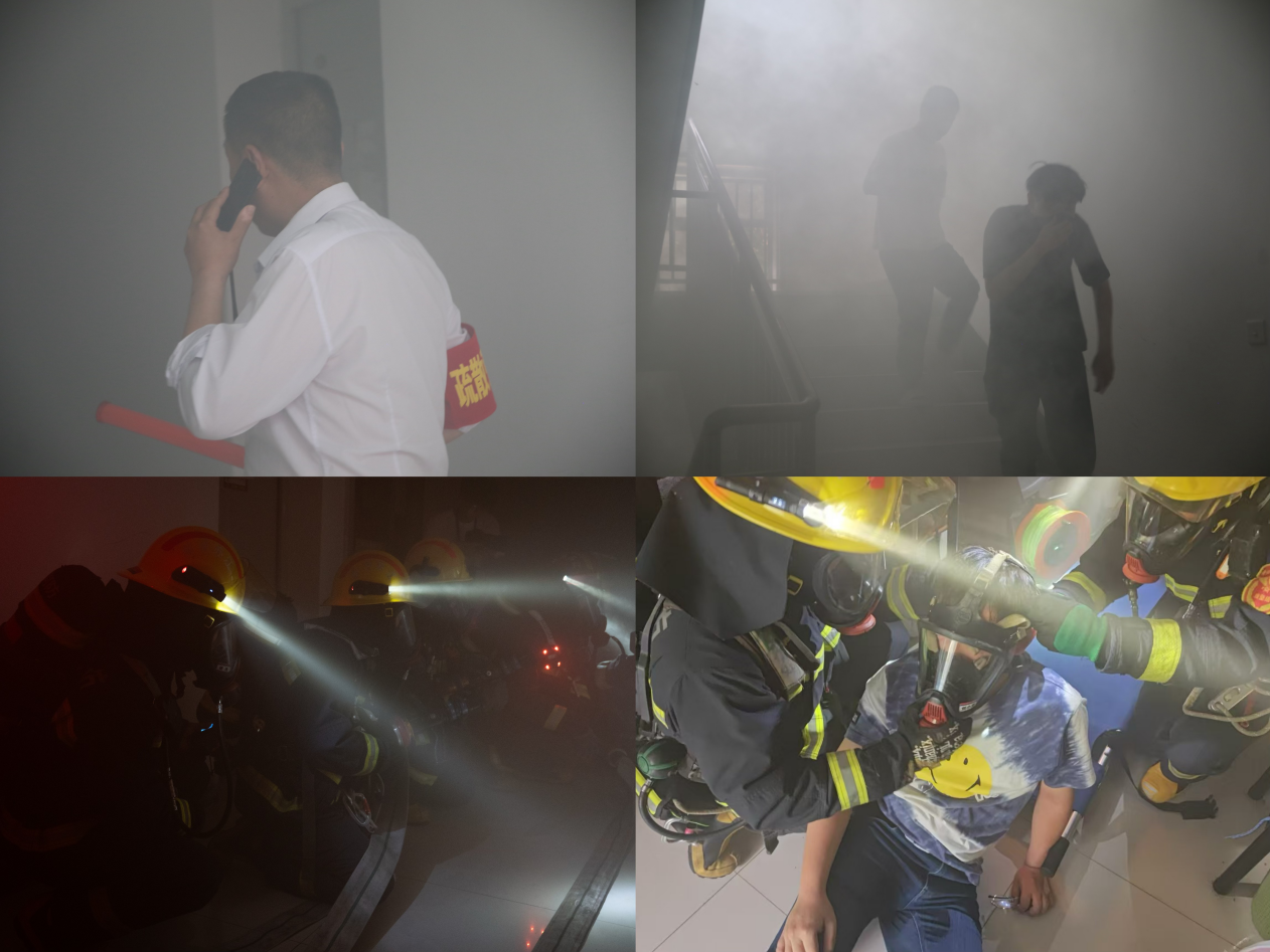 在演练环节,模拟学生宿舍7310突发火灾,现场释放烟雾弹,学生发现火情后迅速报告宿管员,宿管员第一时间响应,赶赴现场确认火情并通报学院消防报警中心,随后各行动小组参照应急预案有条不紊地组织学生疏散,开展初期火情处置。同学们用湿毛巾捂住口鼻,弯腰低姿,沿着安全通道快速有序地撤离到指定安全区域。