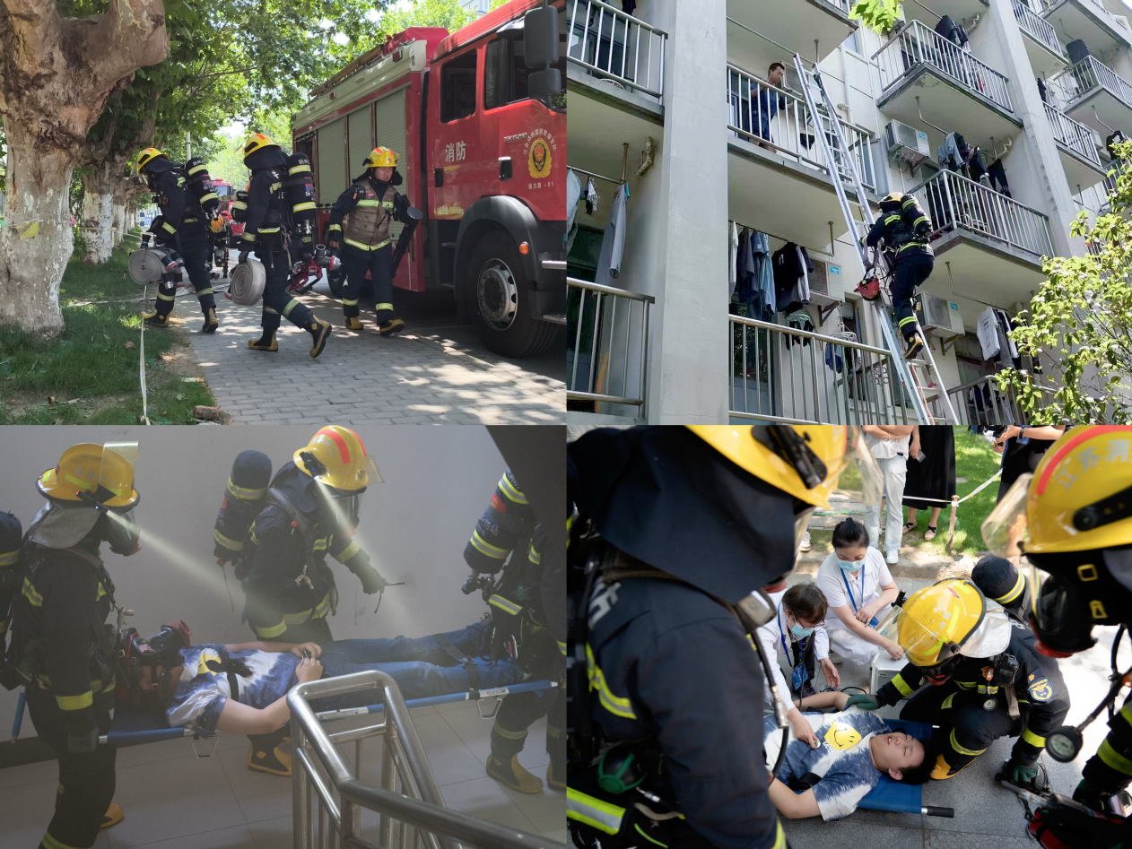 邗江区消防救援大队即刻抵达现场展开救援。消防官兵们动作娴熟地操作消防设备,利用九米拉梯对“被困”在高层的学生进行救援,学院医务室工作人员也在第一时间对“受伤”人员进行紧急救治,整个救援过程紧张有序,展示了救援队伍的专业素养和快速反应能力。